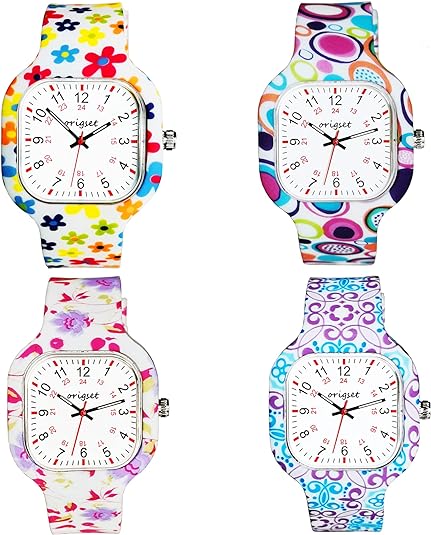 One Watch Face with 4pc Full Printed Straps Inter-changeableNew fashion nurse watch square 38mm diameter watch case with large numbers dial 12 & 24 hour markers, 3-hand hour hand minute hand and sweeping second hand, easy to read time for nurses medical teachers nursing student professionals clinic hospital women men unisex
